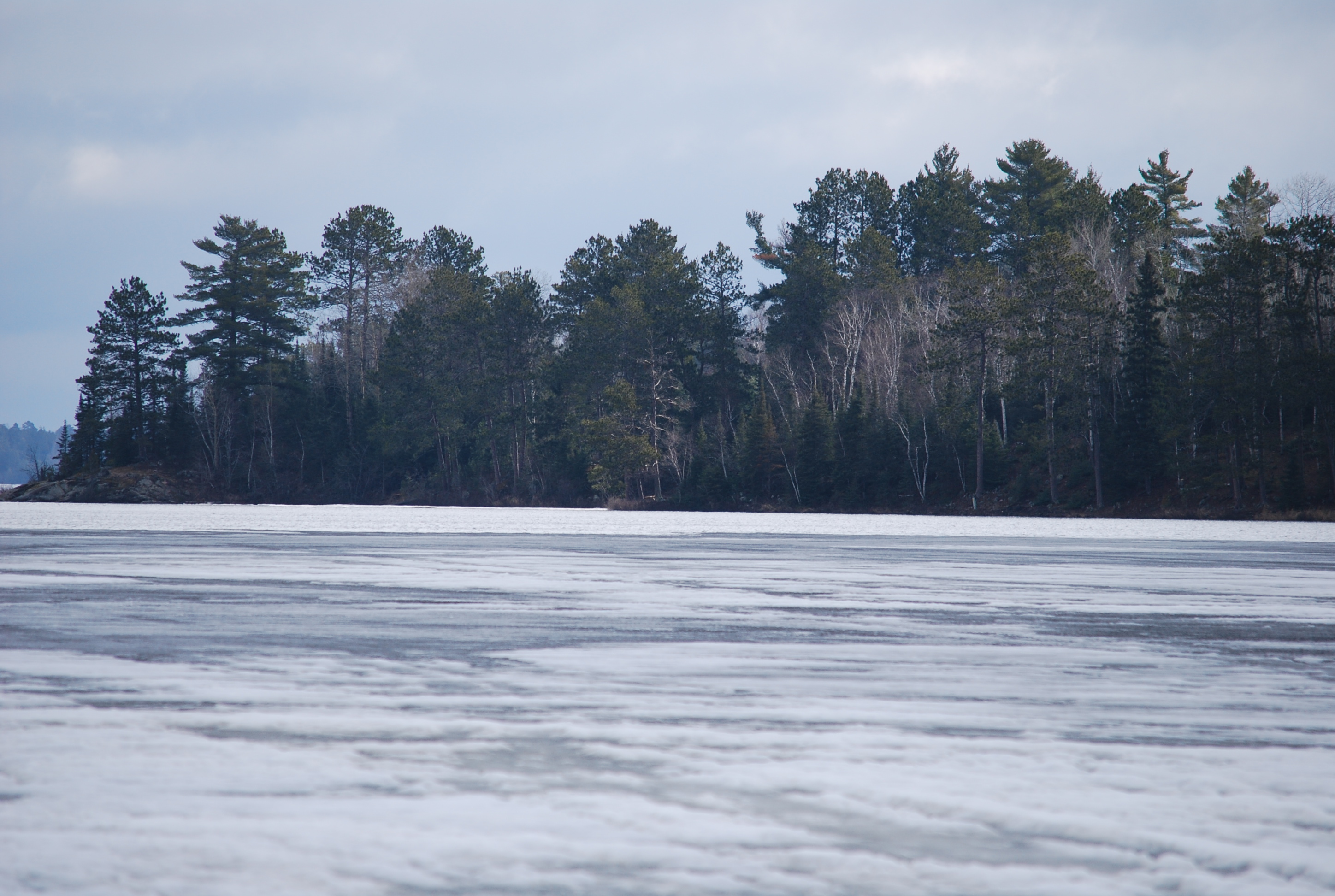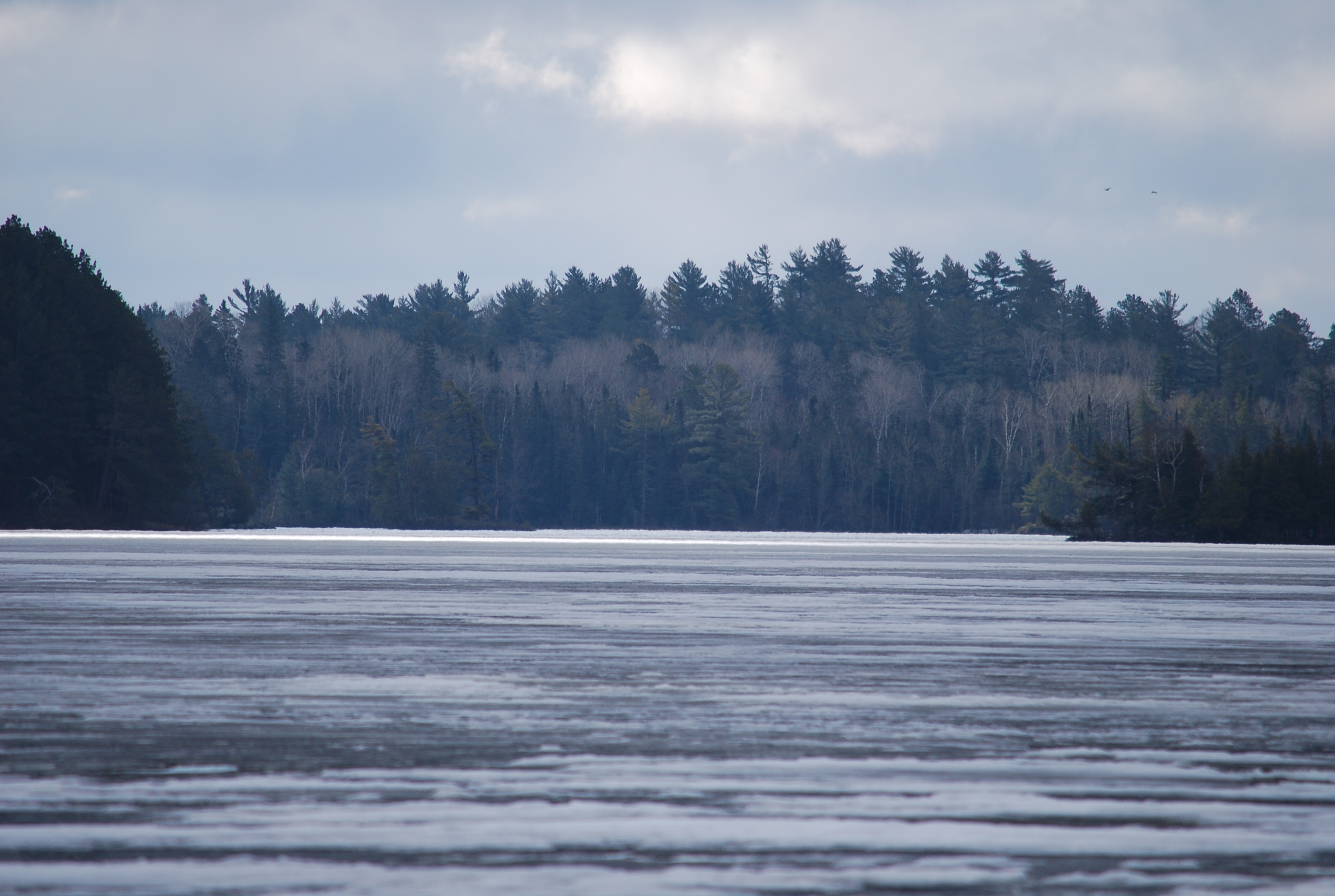 I was just at the South landing on White Iron. There is open water at and through Ring Rock Narrows. Through by binoculars I could see the shimmer of open water all the way to Bear Grease Island and around the island. There is also open water to the south end which I’m sure is a result of very good water flow out of the Bear Island River. The ice also continues to move farther away from Silver Rapids. A good wind today will make a big change happen in the ice everywhere. If you look very closely at the pictures you can see the open water along the shore and Ring Rock. Looking good for soft water fishing next Saturday.